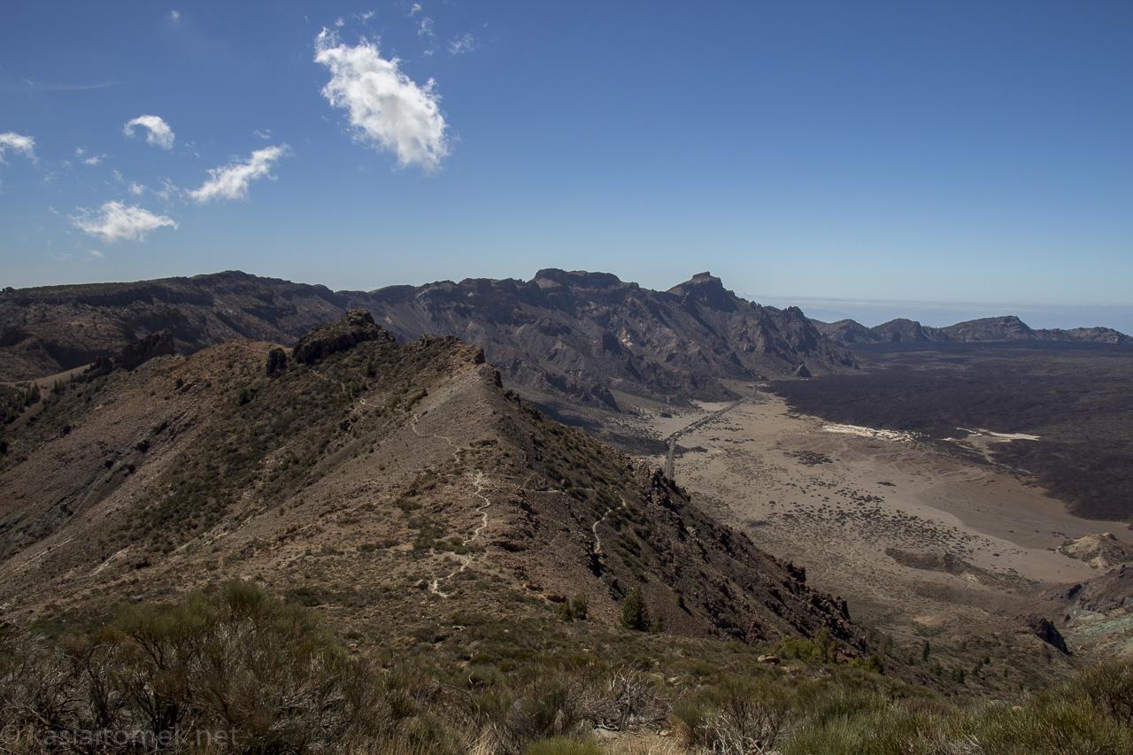 Widoczne po prawej stronie równiny, zwane Las Canadas, to ogromna kaldera, która powstała po zapadnięciu się istniejącego niegdyś wulkanu (miał 40 km średnicy).