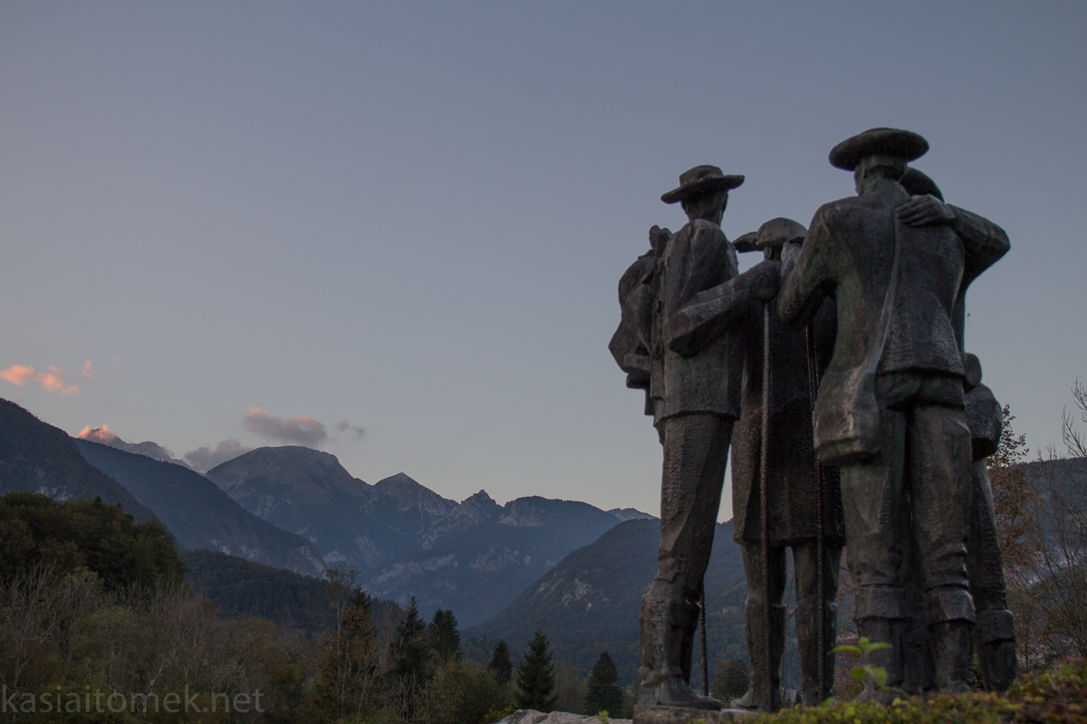 Pomnik czterech odważnych mężczyzn z Bohinj – pierwszych zdobywców Triglava (w 1778 r.). Jedna z postaci wskazuje na najwyższy szczyt Słowenii (na zdjęciu w chmurach, oświetlony przez zachodzące słońce).