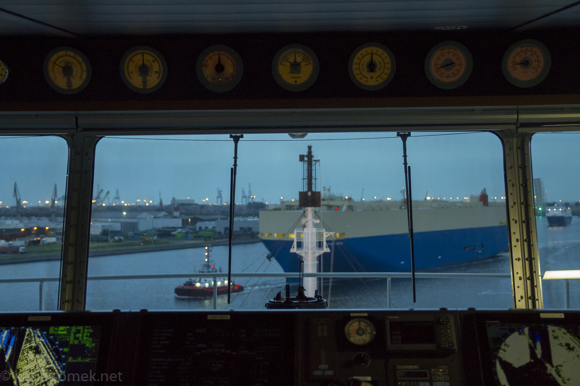 Widok z mostku na port. W śluzie zapaliło się już zielone światło – możemy ruszać 🙂